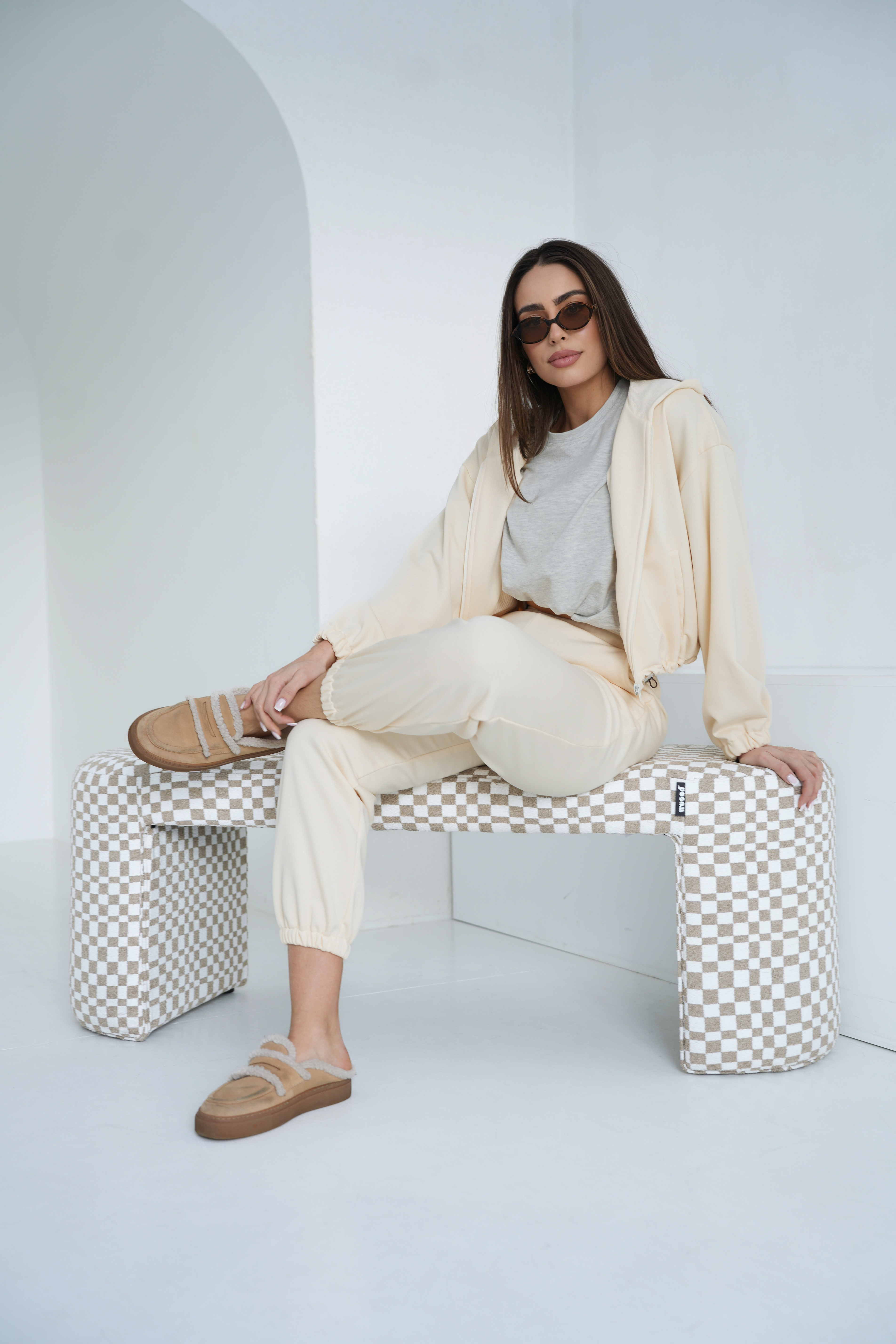 Komplet dresowy o klasycznym, wygodnym fasonie. Bluza z kapturem posiada odpinaną formę, co zwiększa funkcjonalność i pozwala dopasować stylizację do potrzeb. Krój jest swobodny, zapewnia komfort noszenia i naturalnie układa się na sylwetce.