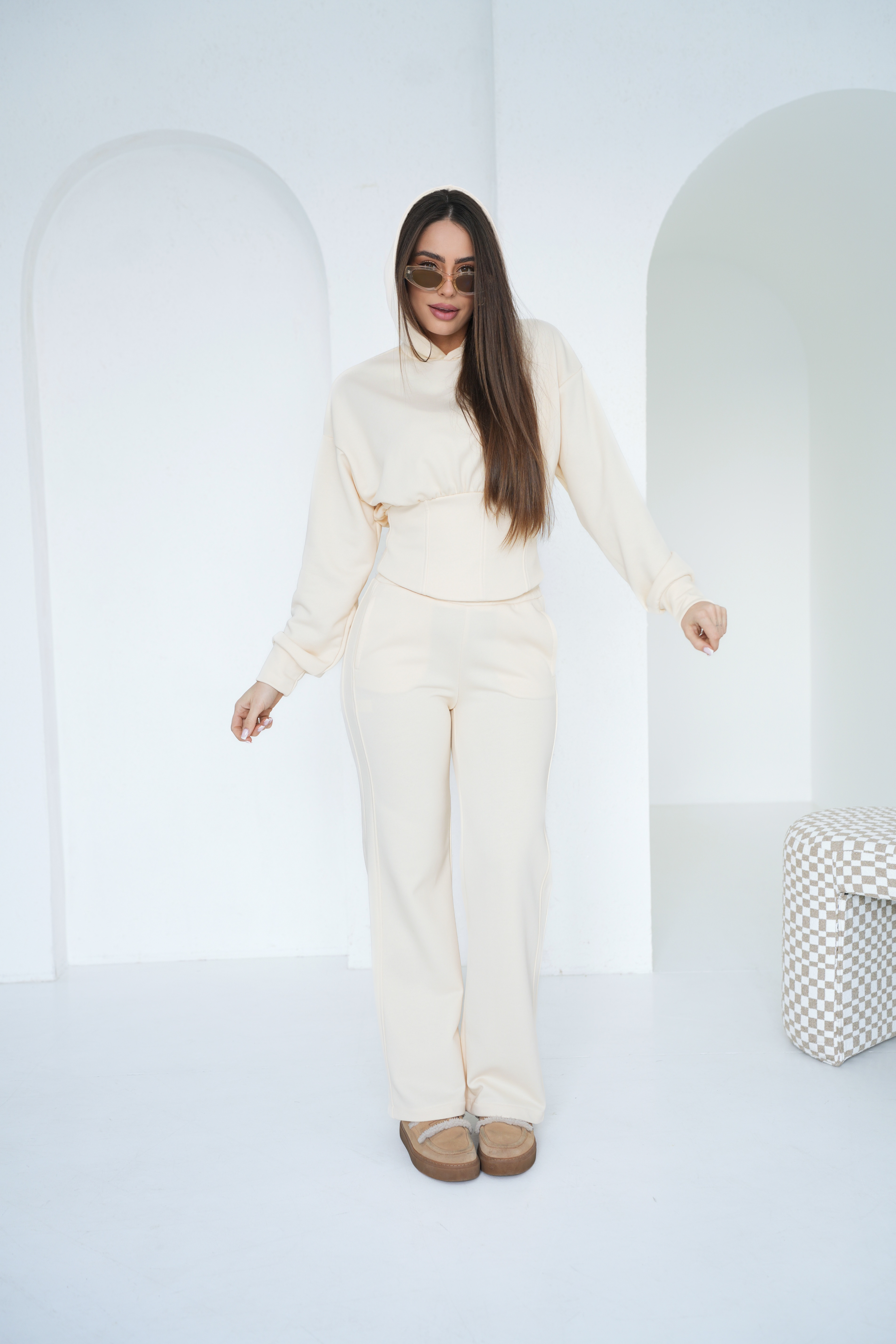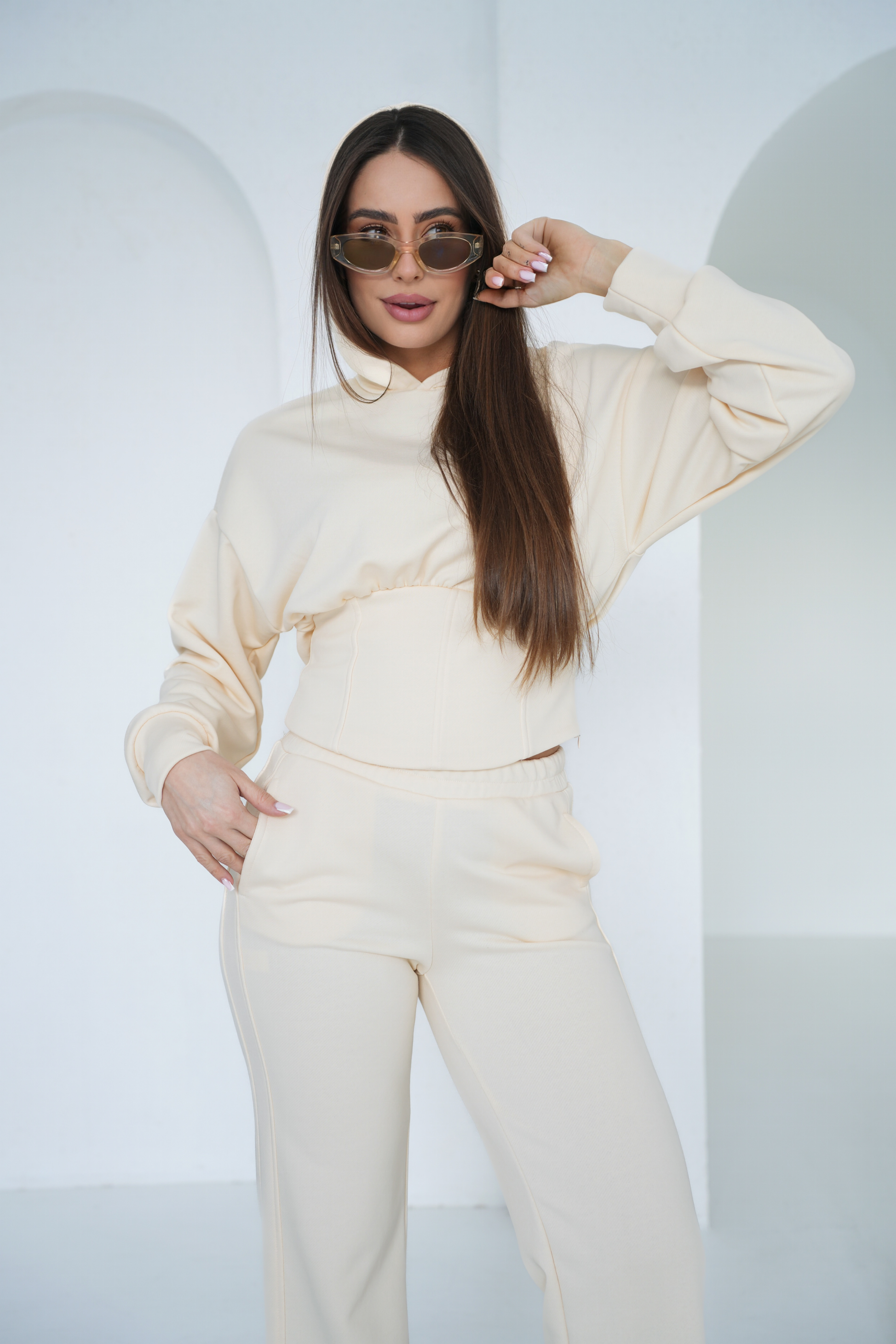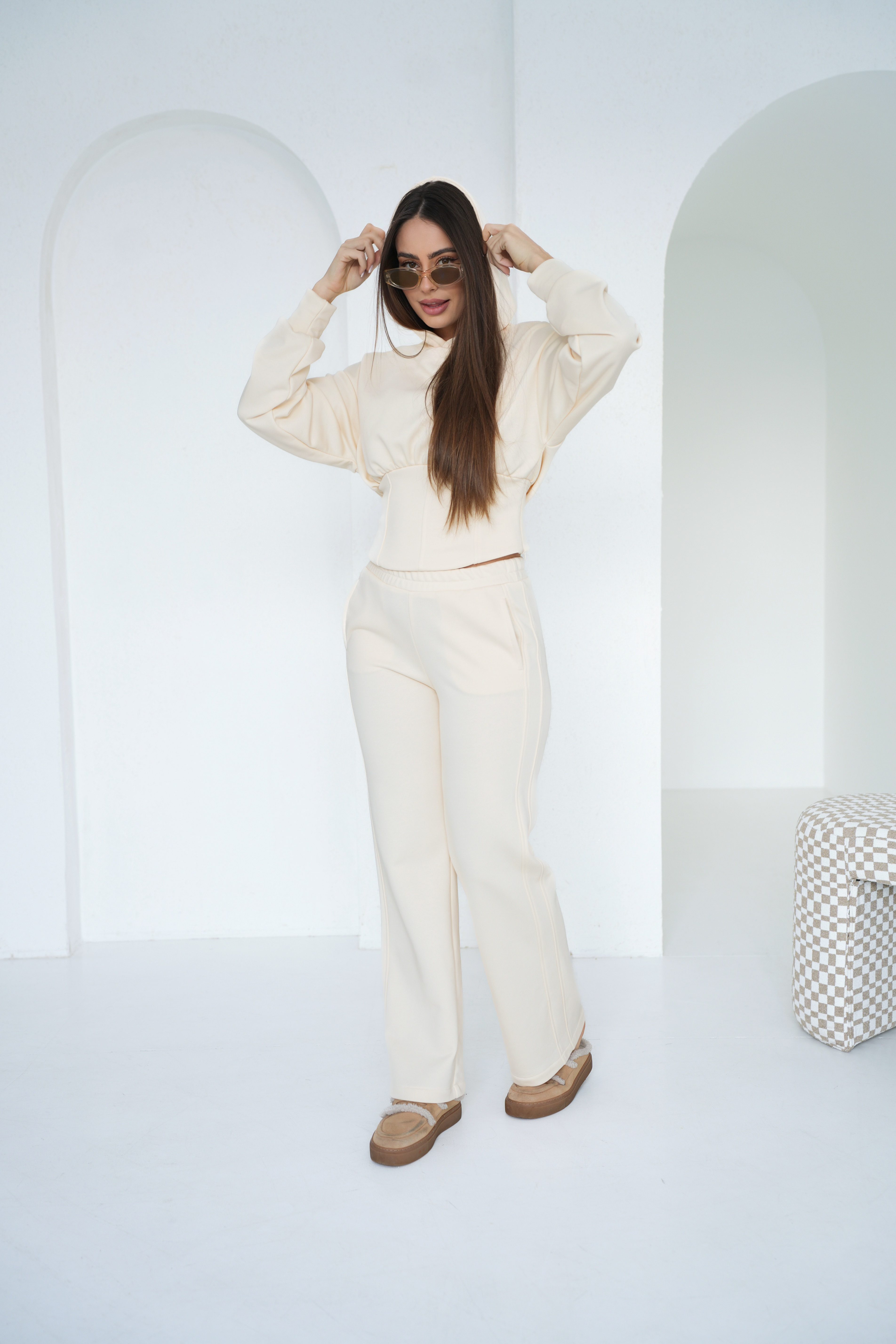 Spodnie o prostej, wydłużającej nogawkę linii równoważą formę góry, tworząc spójną i harmonijną całość. To zestaw, który łączy wygodę dzianiny z uporządkowanym, nowoczesnym fasonem — sprawdzi się zarówno na co dzień, jak i w bardziej dopracowanych stylizacjach.