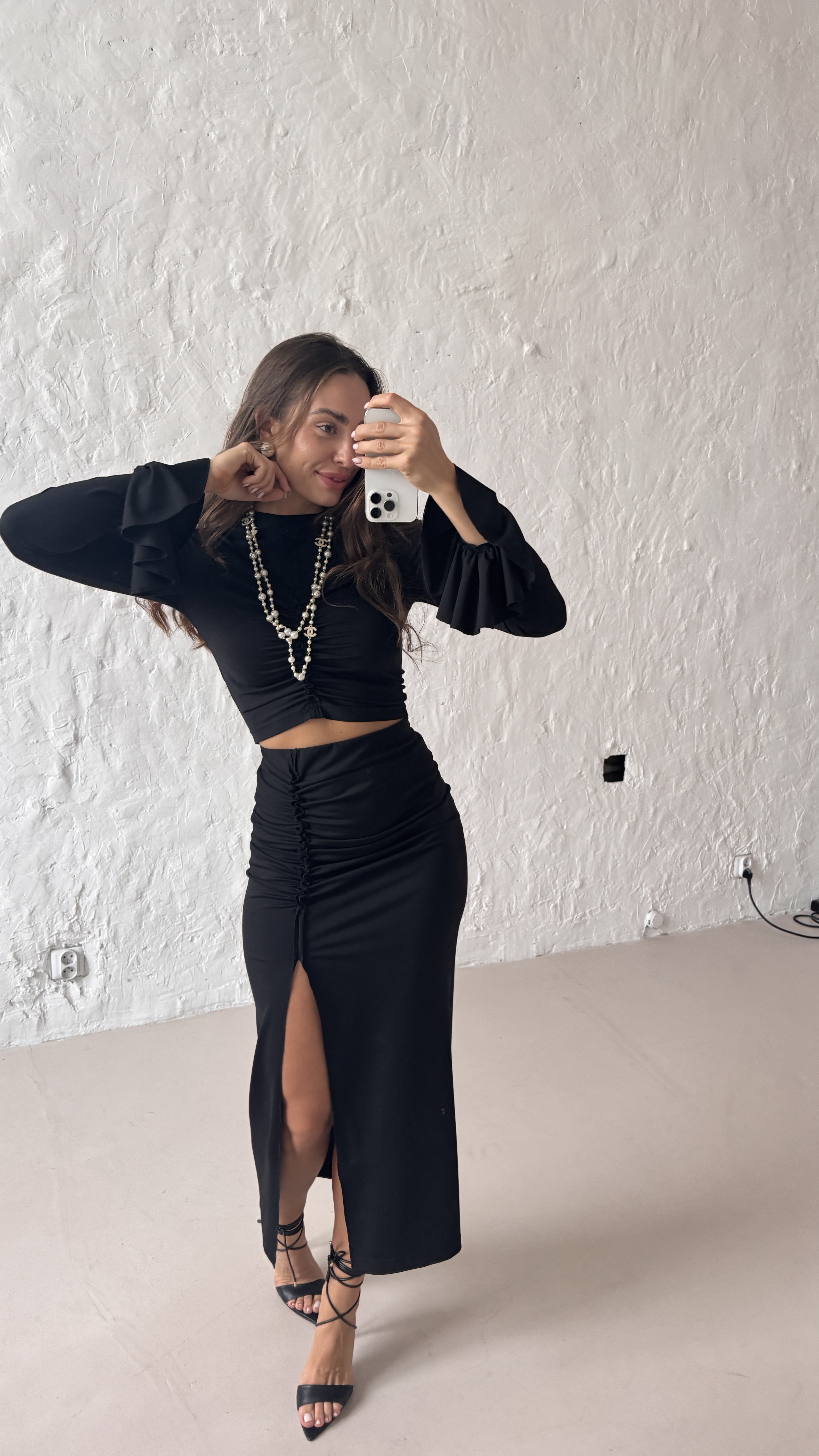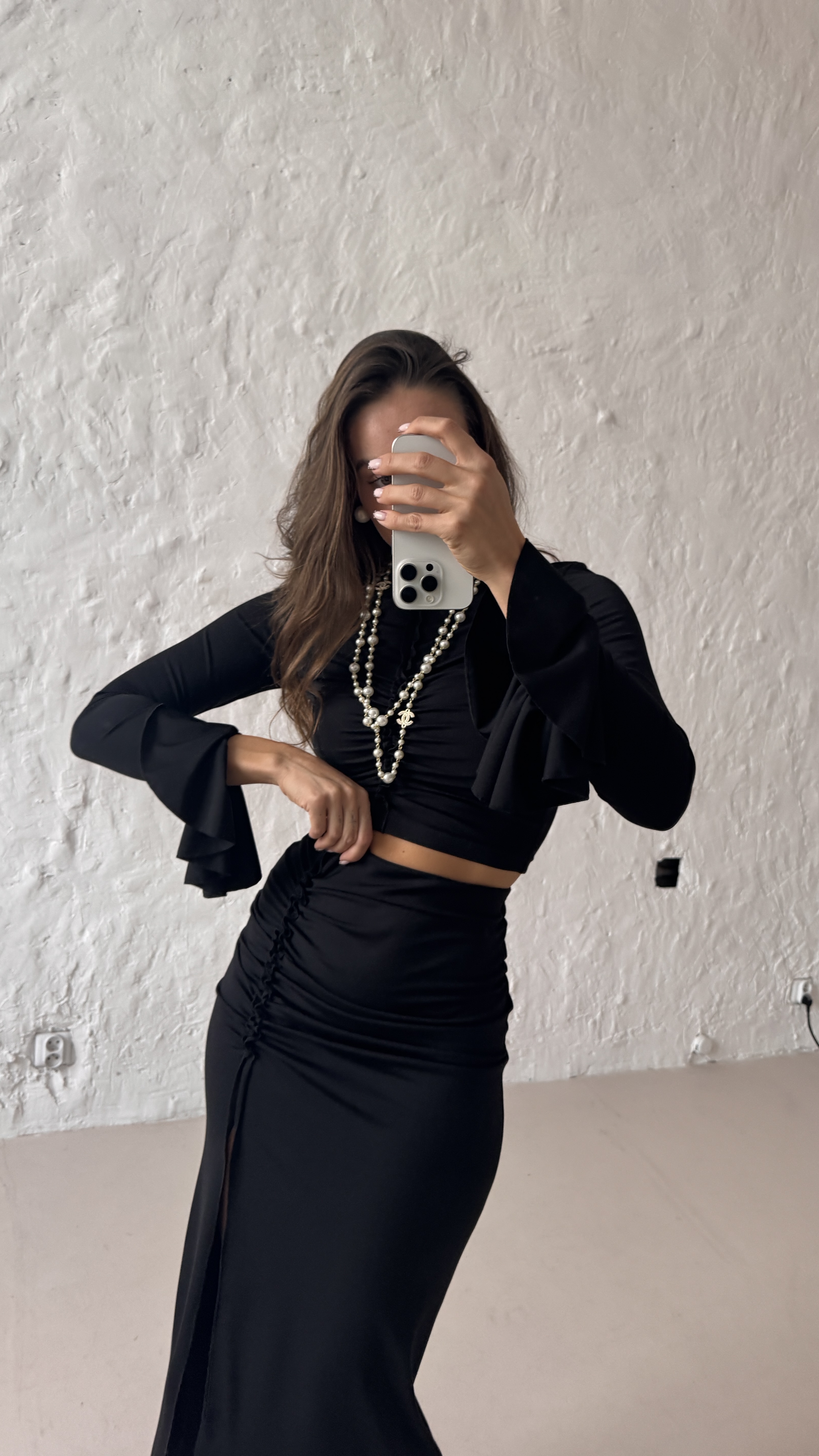 Dwuczęściowy komplet z długą spódnicą to elegancka i kobieca propozycja. Dopasowany top z długim rękawem i falbanami przy mankietach nadaje sylwetce lekkości, a spódnica midi z efektownym marszczeniem i wysokim rozcięciem eksponuje nogi i podkreśla talię.