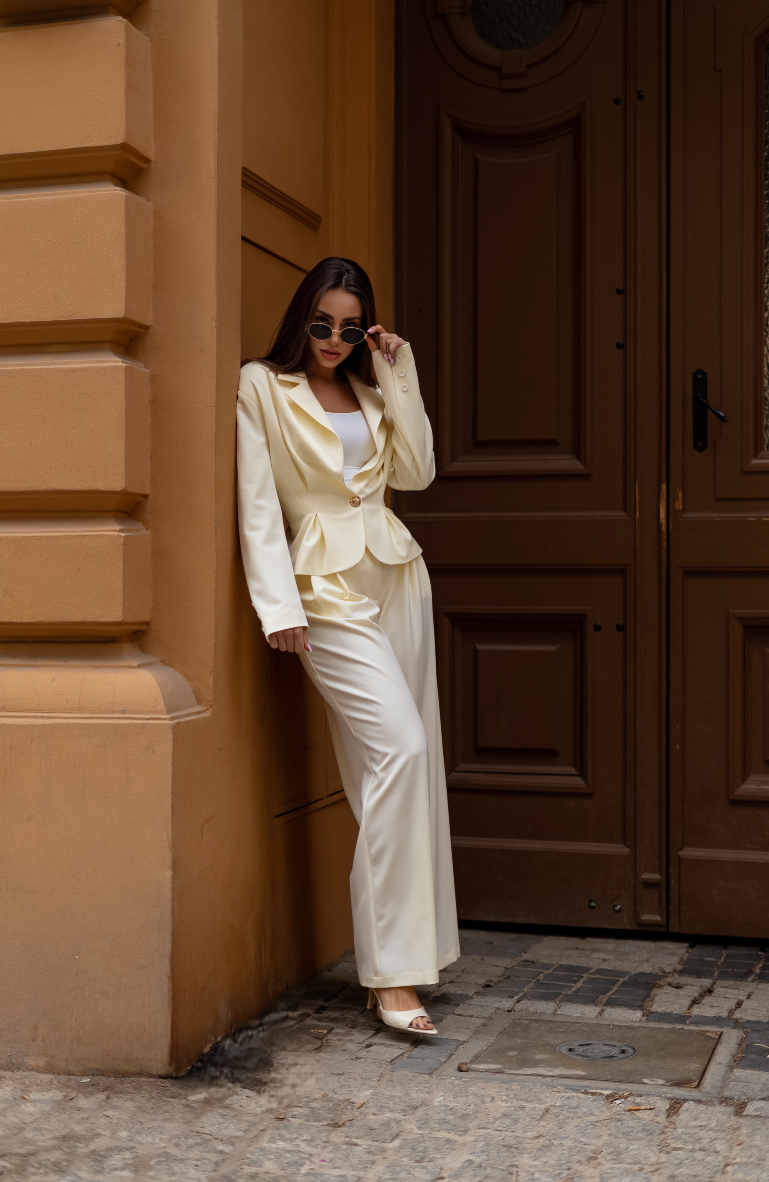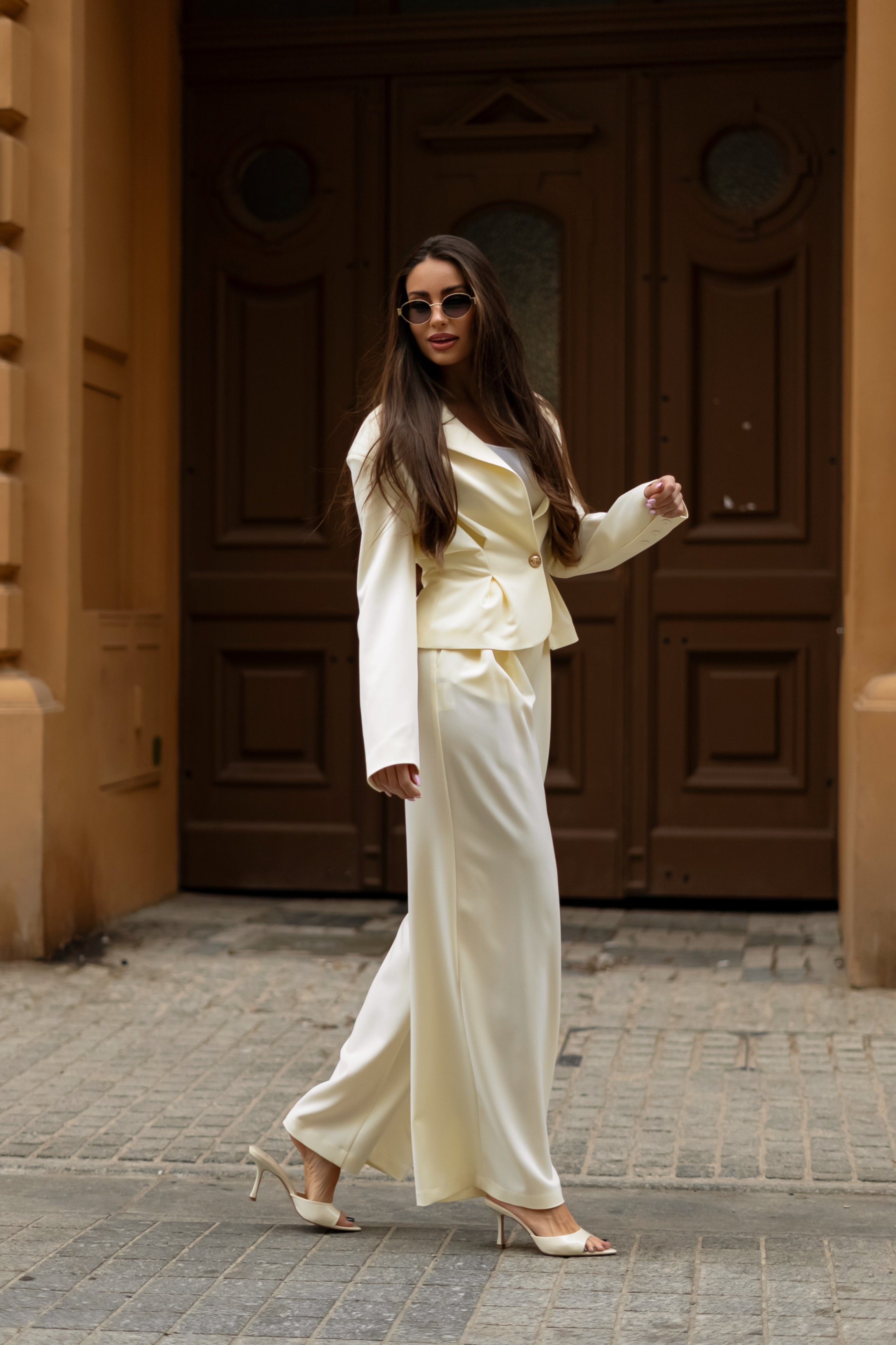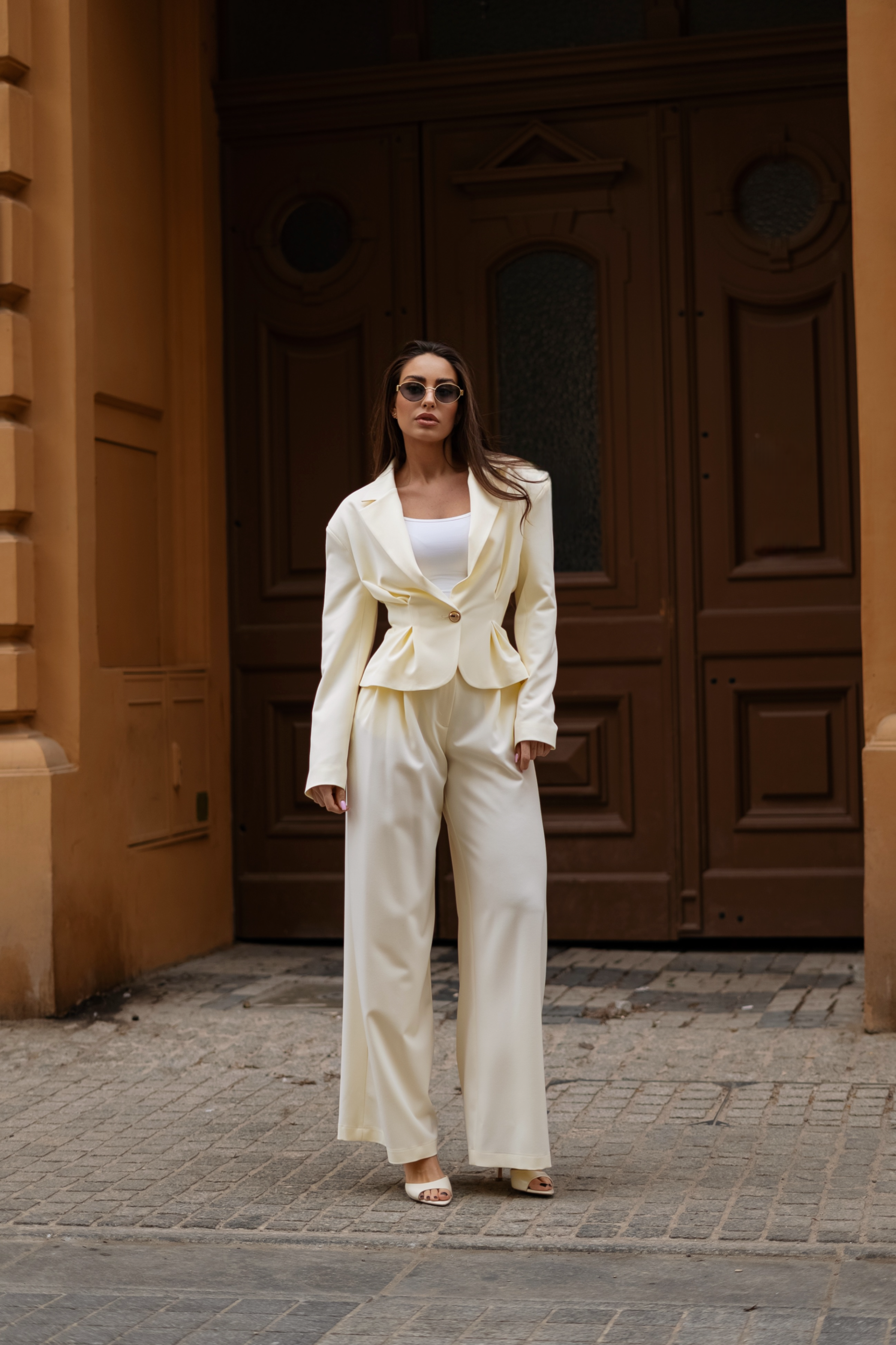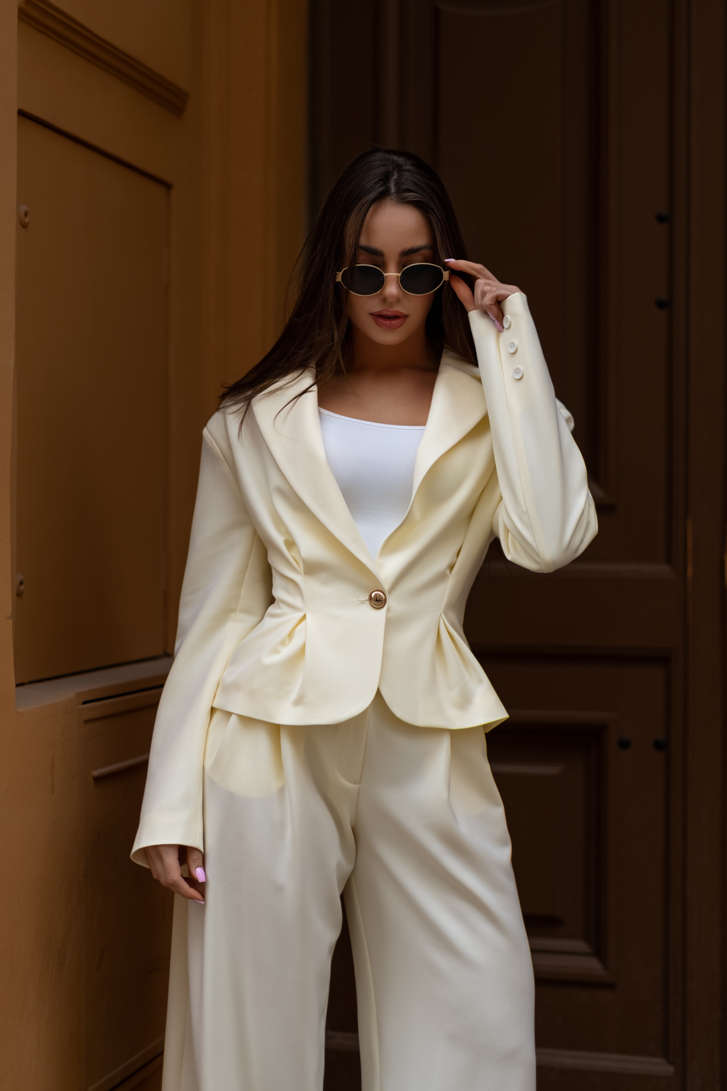 Elegancki, minimalistyczny komplet w jasnym, kremowym odcieniu, który łączy nowoczesną formę z ponadczasową klasą. Dopasowana marynarka z podkreśloną talią nadaje sylwetce wyrafinowany kształt, a szerokie spodnie tworzą harmonijną, swobodnie układającą się linię. Całość tworzy spójny, stylowy look idealny zarówno na formalne okazje, jak i codzienną elegancję.