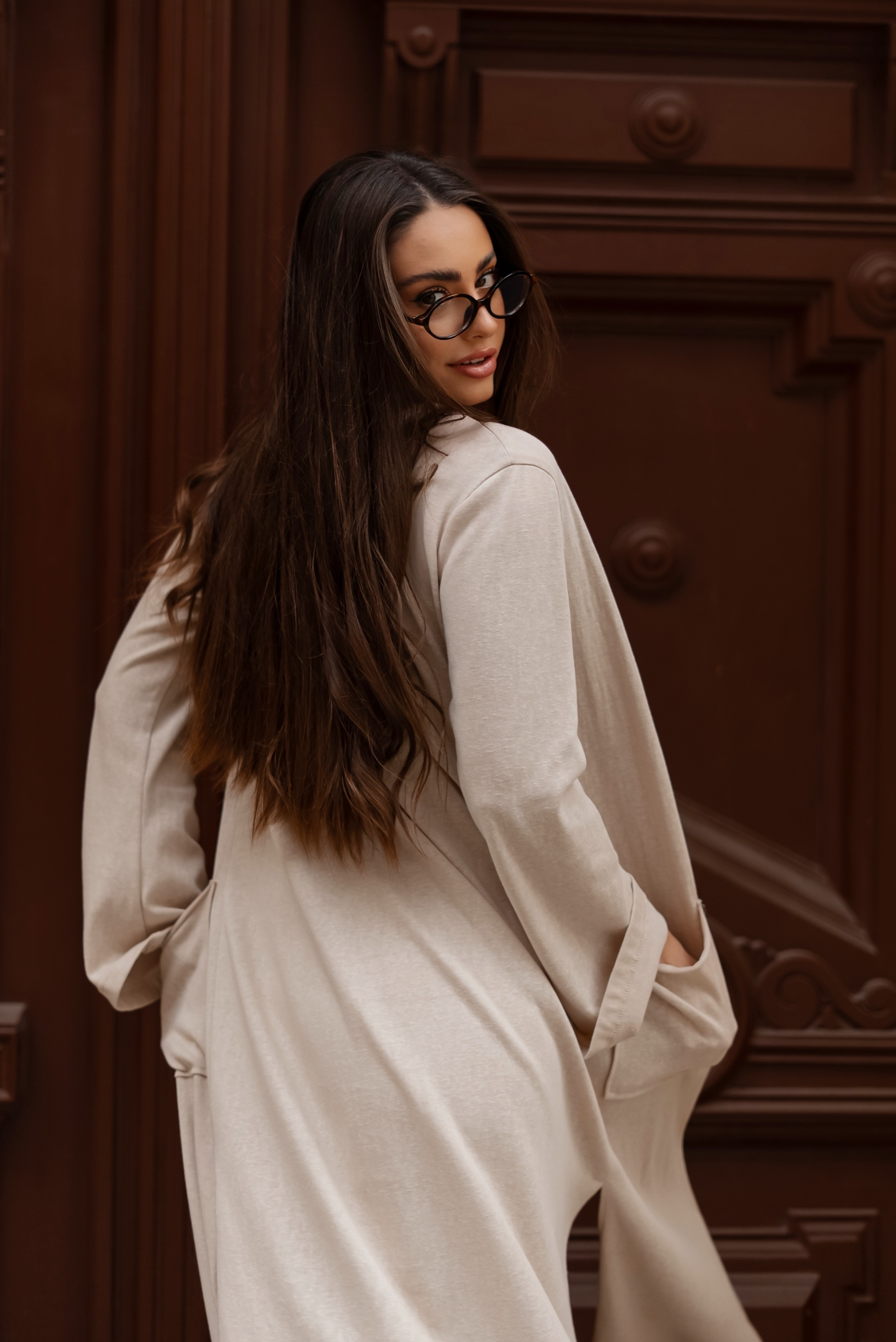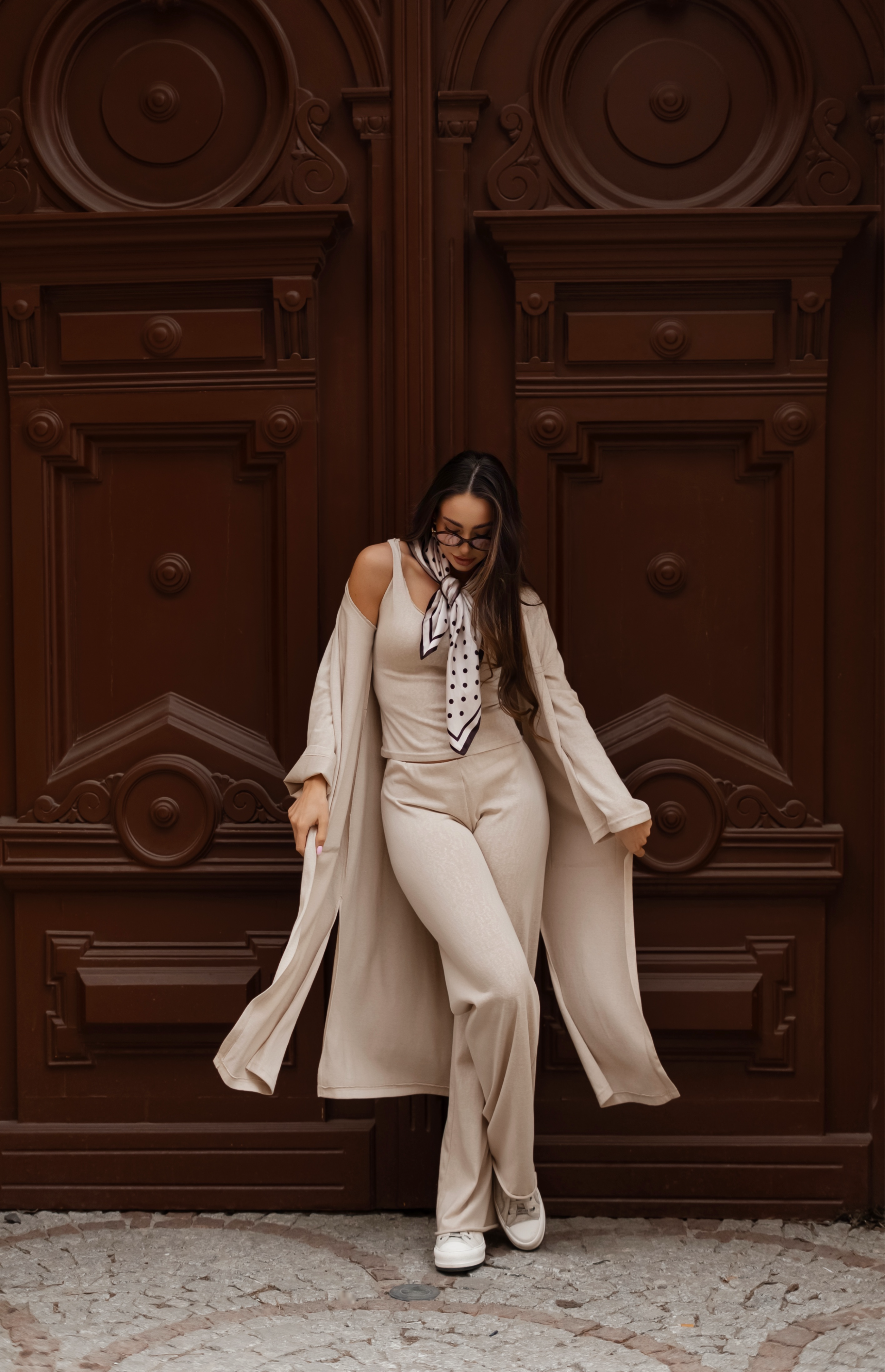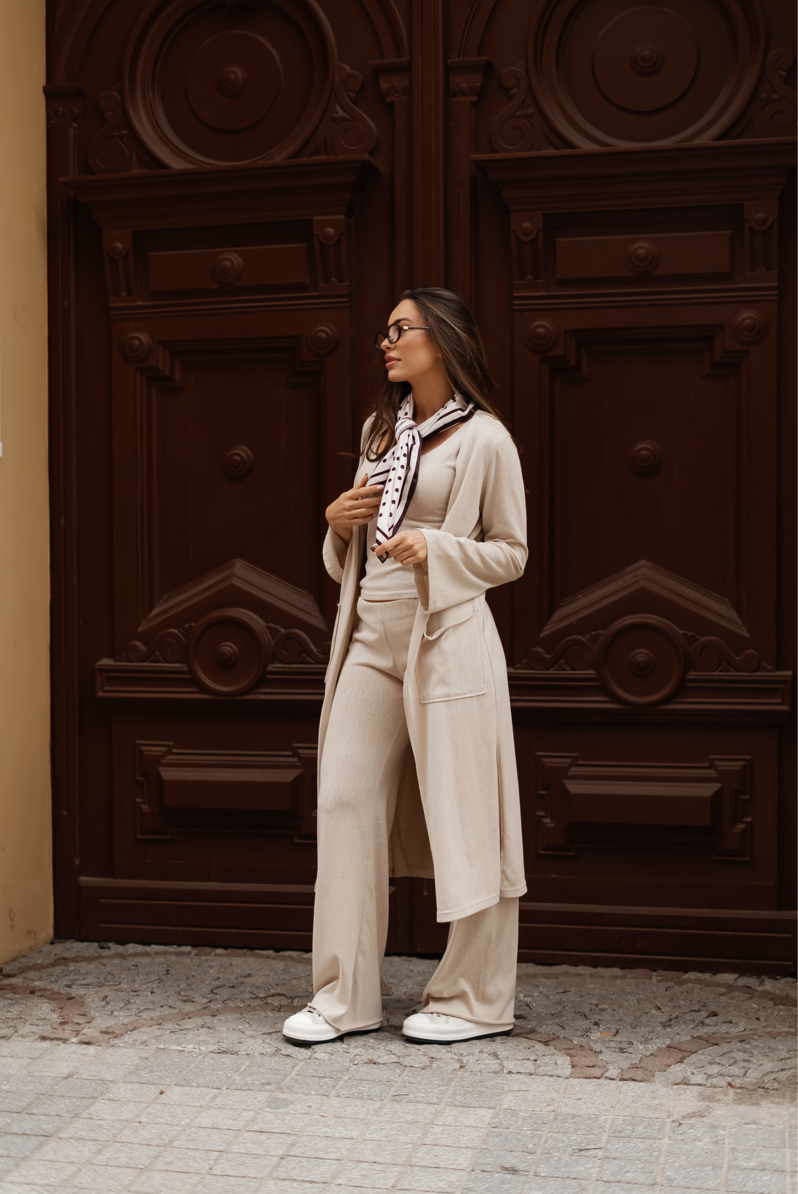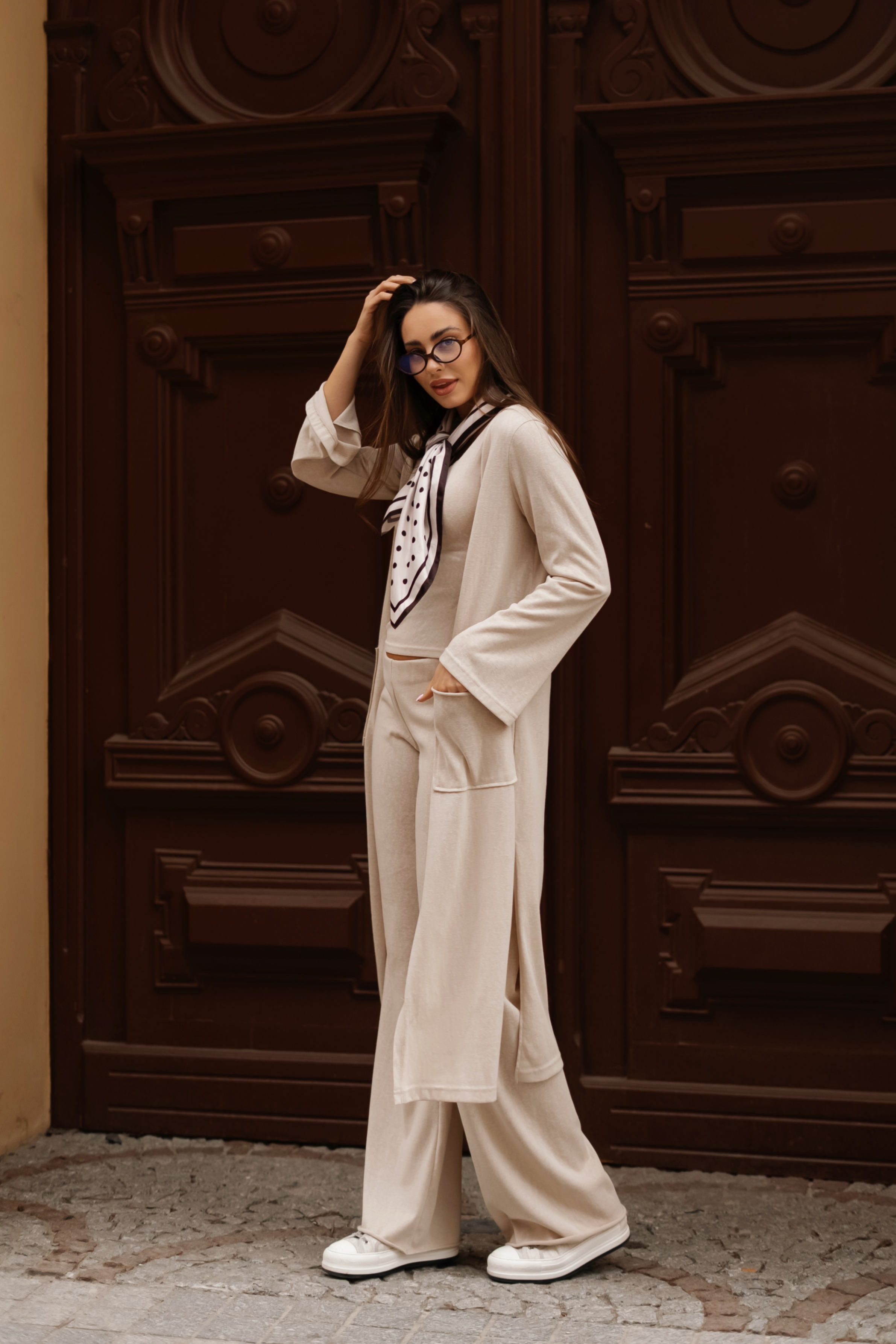 Komfortowy, trzyczęściowy komplet, który łączy minimalistyczny styl z maksymalną wygodą. Dopasowana koszulka podkreśla sylwetkę, szerokie spodnie nadają lekkości całej stylizacji, a długi kardigan tworzy spójną, swobodną formę idealną na co dzień. Całość prezentuje się nowocześnie i uniwersalnie, sprawdzając się zarówno w casualowych, jak i bardziej dopracowanych zestawach.