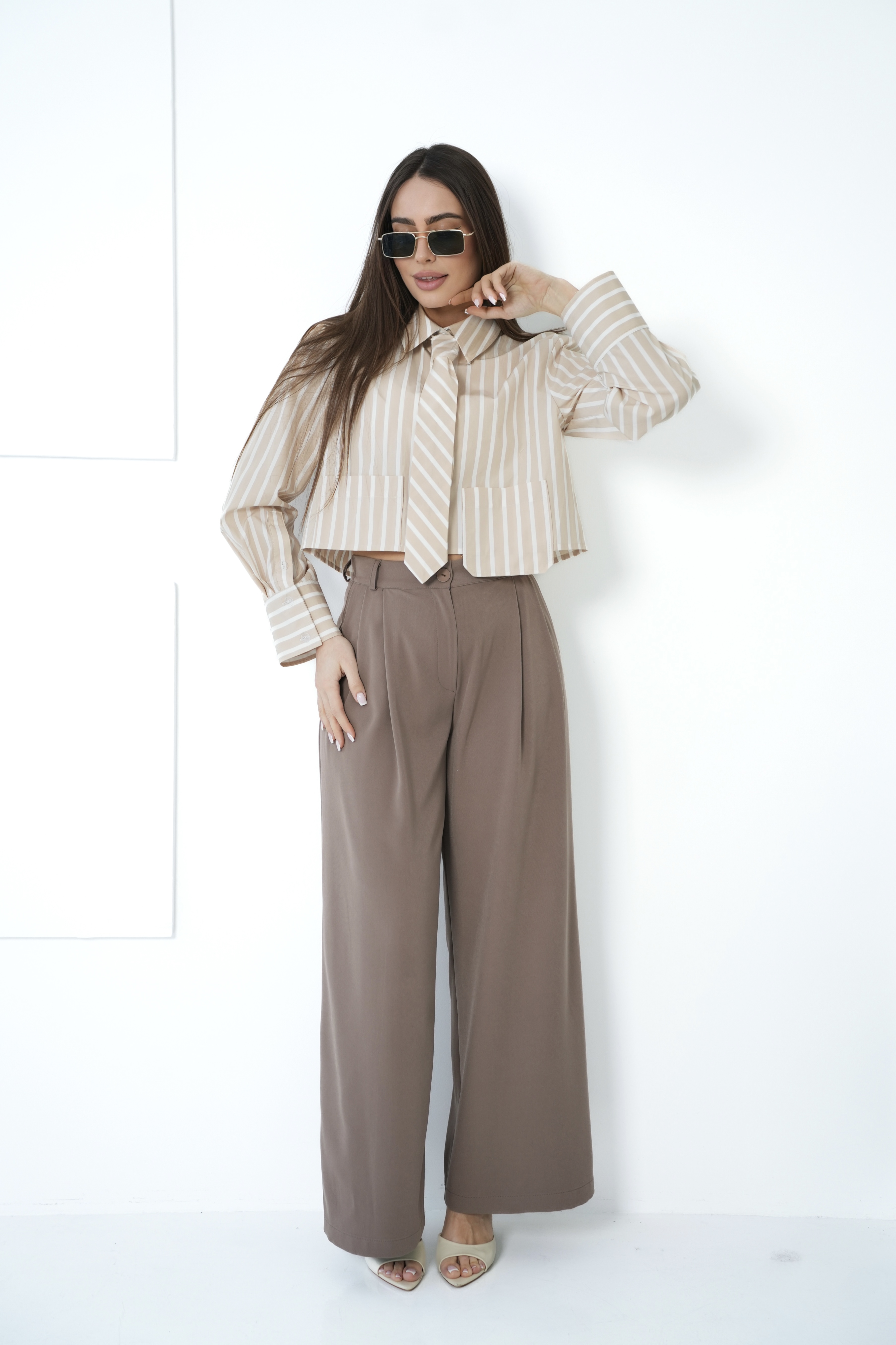 Krótki, lekko oversize’owy krój koszuli zestawiony z krawatem nadaje całości charakteru inspirowanego modą lat 90., a pionowe paski optycznie wysmuklają sylwetkę. To model, który świetnie sprawdzi się zarówno w casualowych, jak i bardziej stylowych, miejskich outfitach.