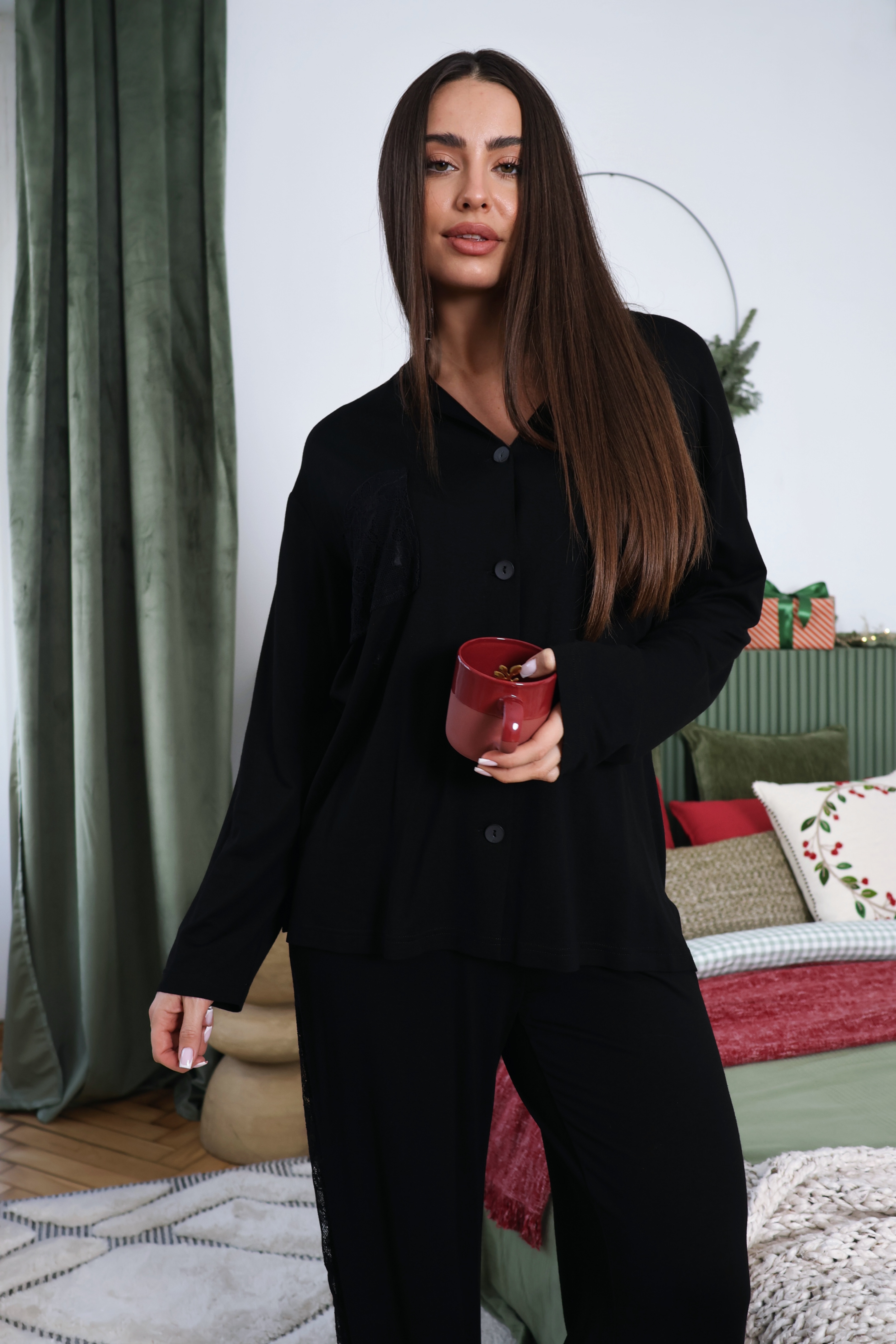 Elegancki komplet domowy, który łączy wygodę z bardzo kobiecym wykończeniem.  Wiskozowa koszula zapinana na guziki i spodnie na gumkę, które mają po bokach wstawki z czarnej koronki, dodając lekkości i elegancji