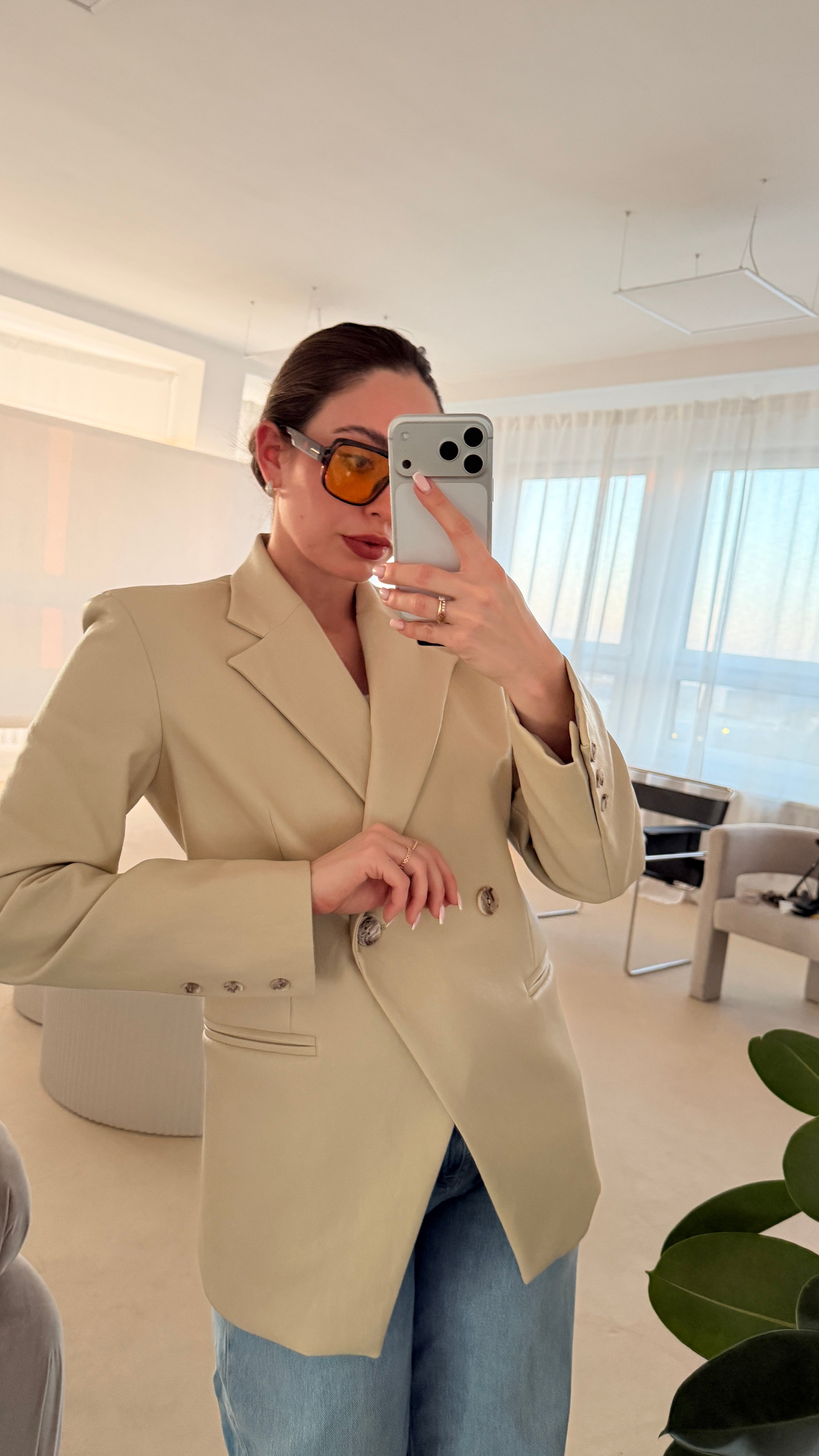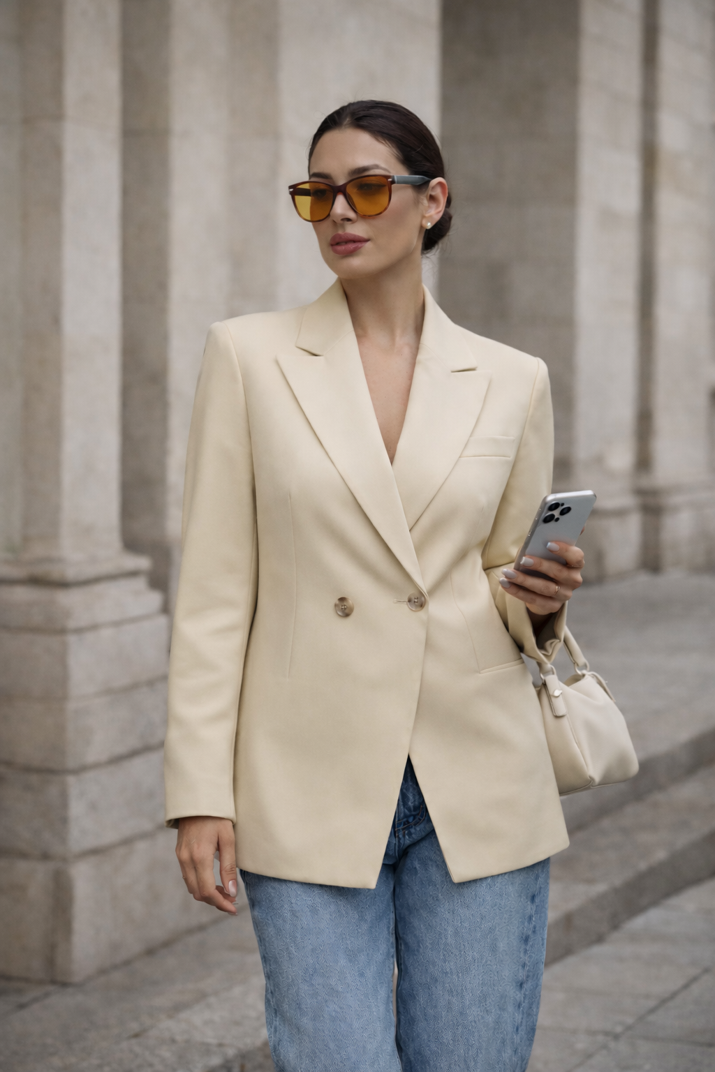 Marynarka dwurzędowa z eko skóry, wykończona podszewką. Zapinana na ozdobne guziki, delikatne poduszki w ramionach, kieszenie. Lekko taliowana