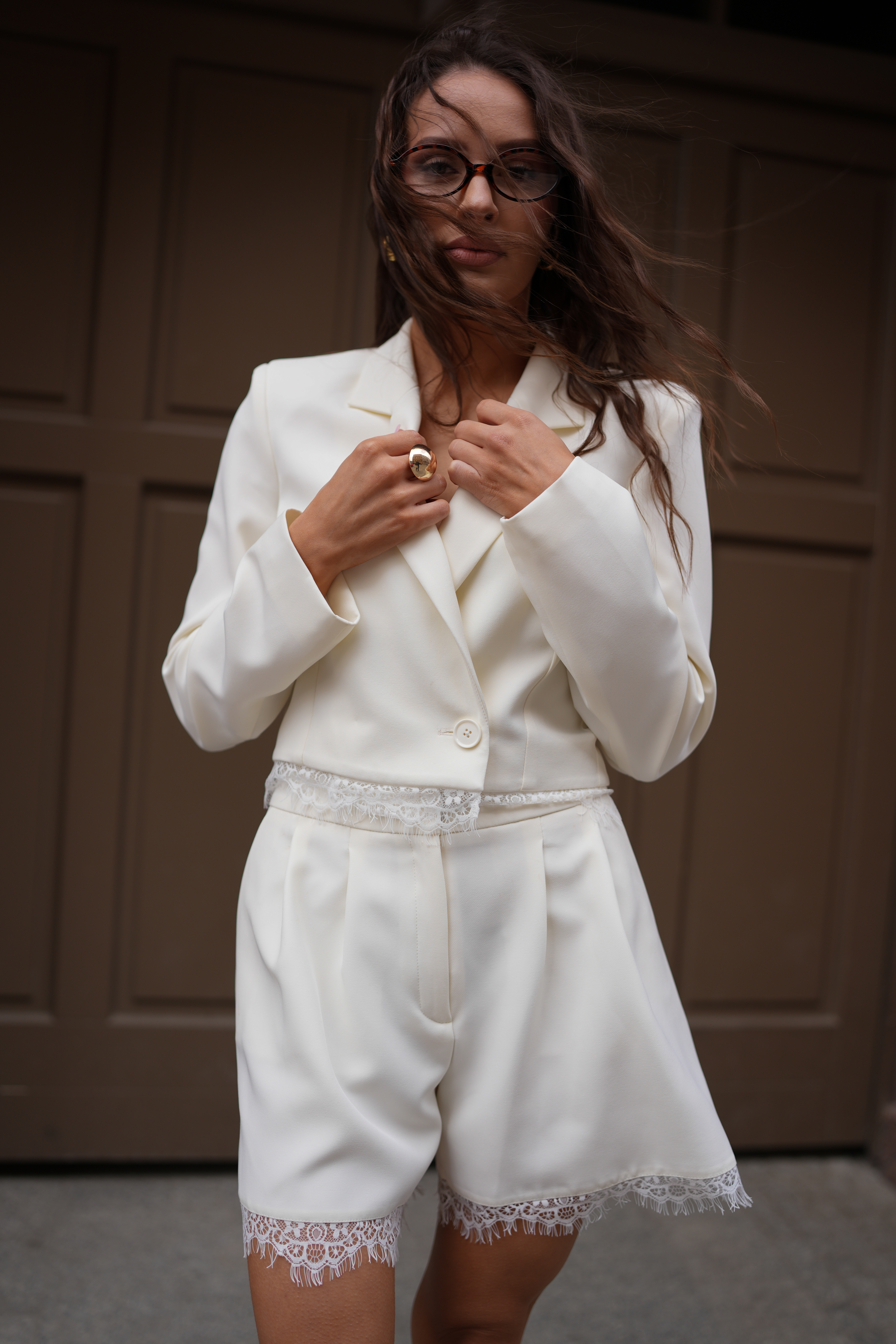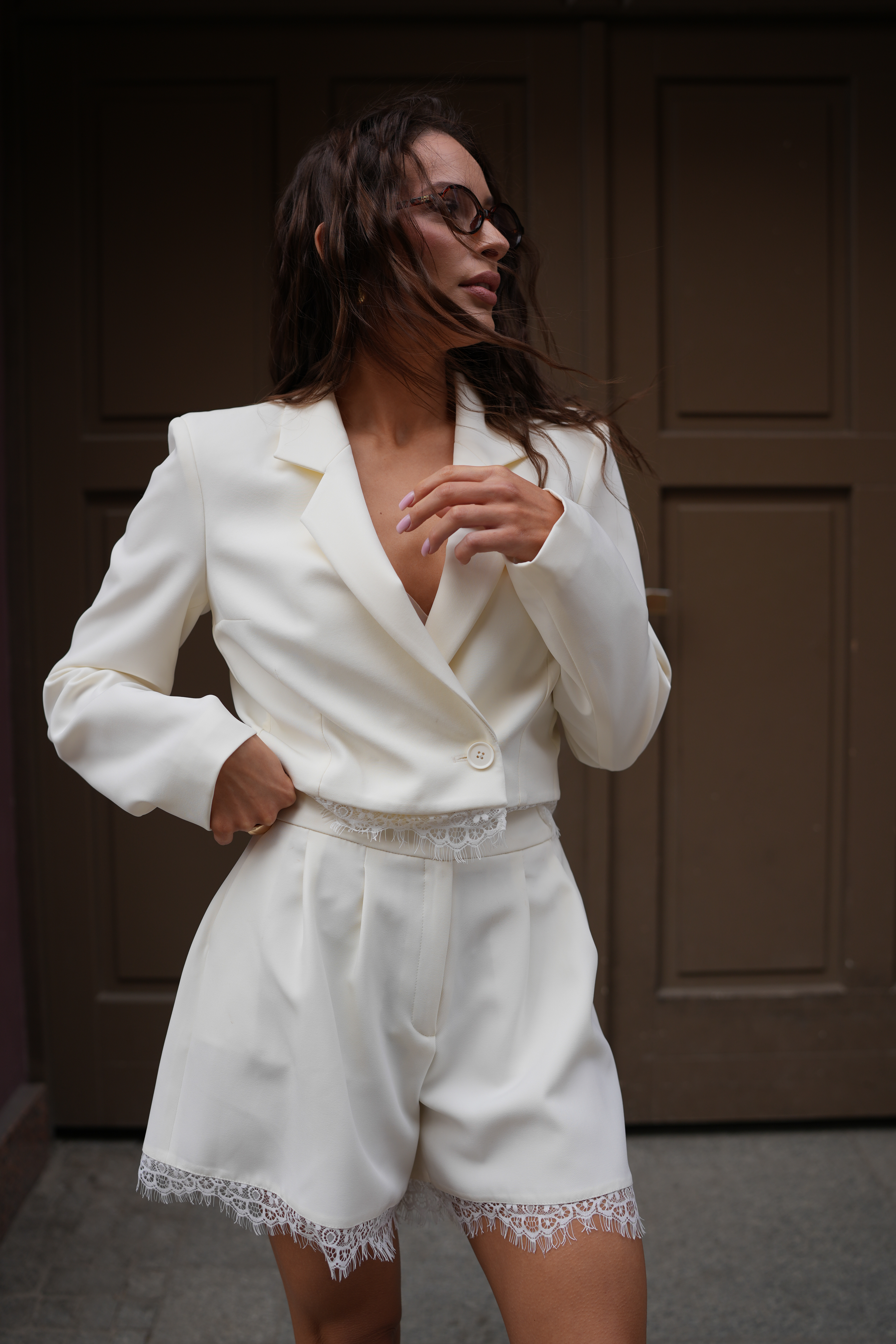 Ten komplet to definicja nowoczesnej elegancji w lekkim, kobiecym wydaniu. Taliowana marynarka o minimalistycznym kroju pięknie podkreśla sylwetkę, a krótkie spodenki z wysokim stanem dodają całości świeżości i subtelnej zmysłowości. Całość tworzy spójny, dopracowany look wykończony koronką, który sprawdzi się zarówno na wyjątkowe okazje, jak i w codziennych, stylowych stylizacjach.