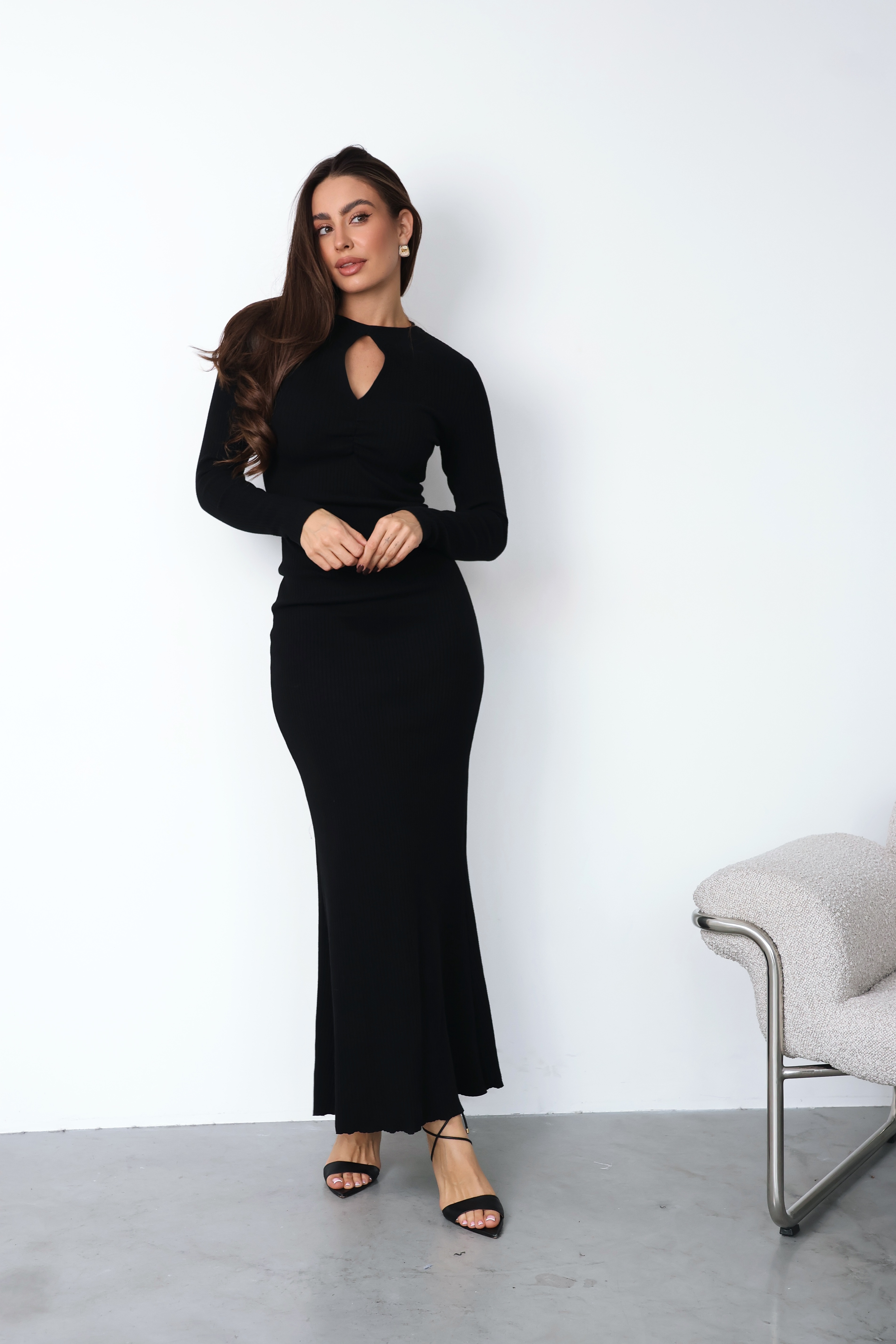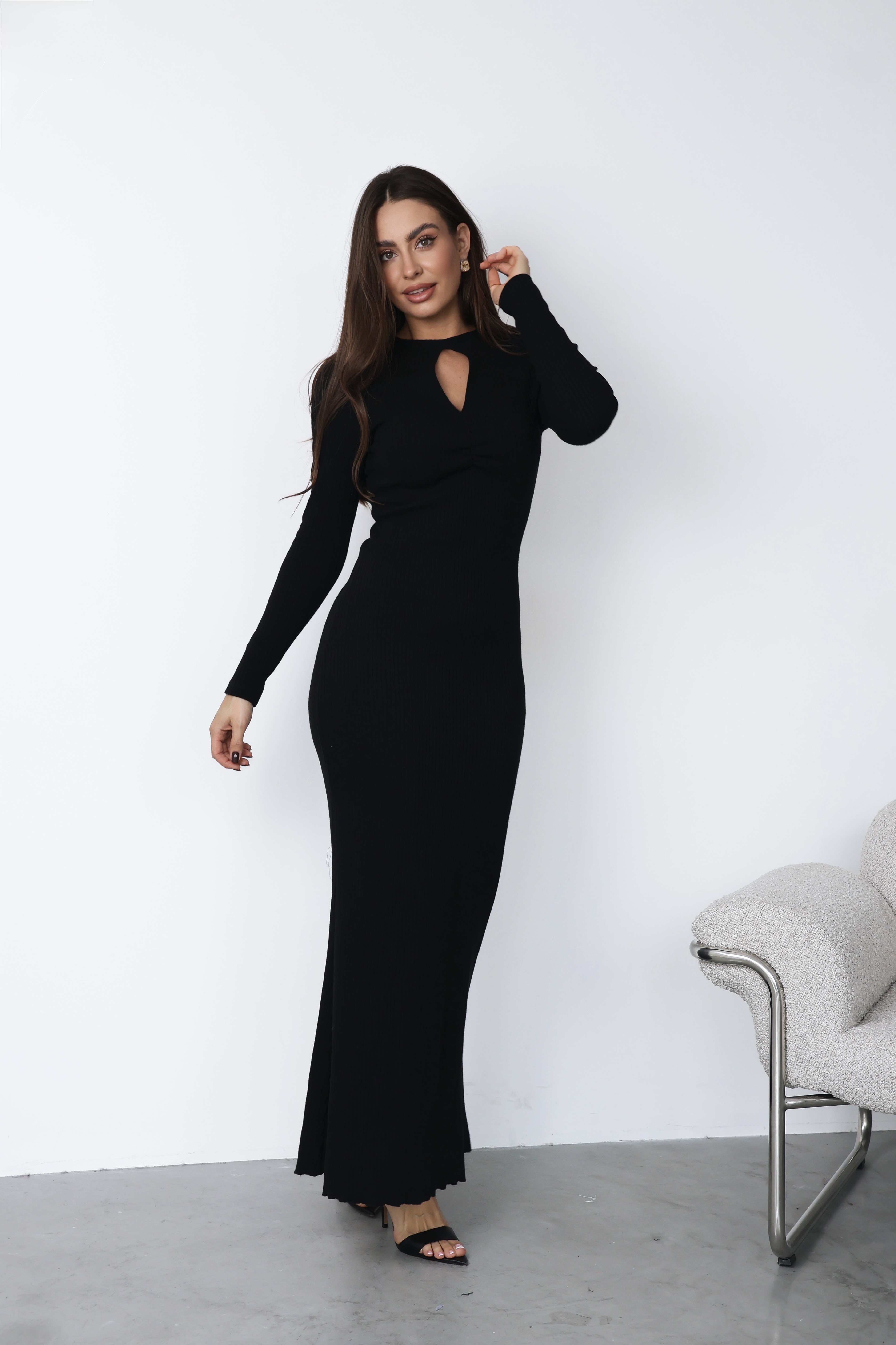Klasyczna, dopasowana sukienka o długości maxi, wykonana z elastycznej prążkowanej dzianiny, która pięknie podkreśla sylwetkę. Model z długim rękawem i subtelnym wycięciem przy dekolcie dodaje całości zmysłowego, a zarazem eleganckiego charakteru.