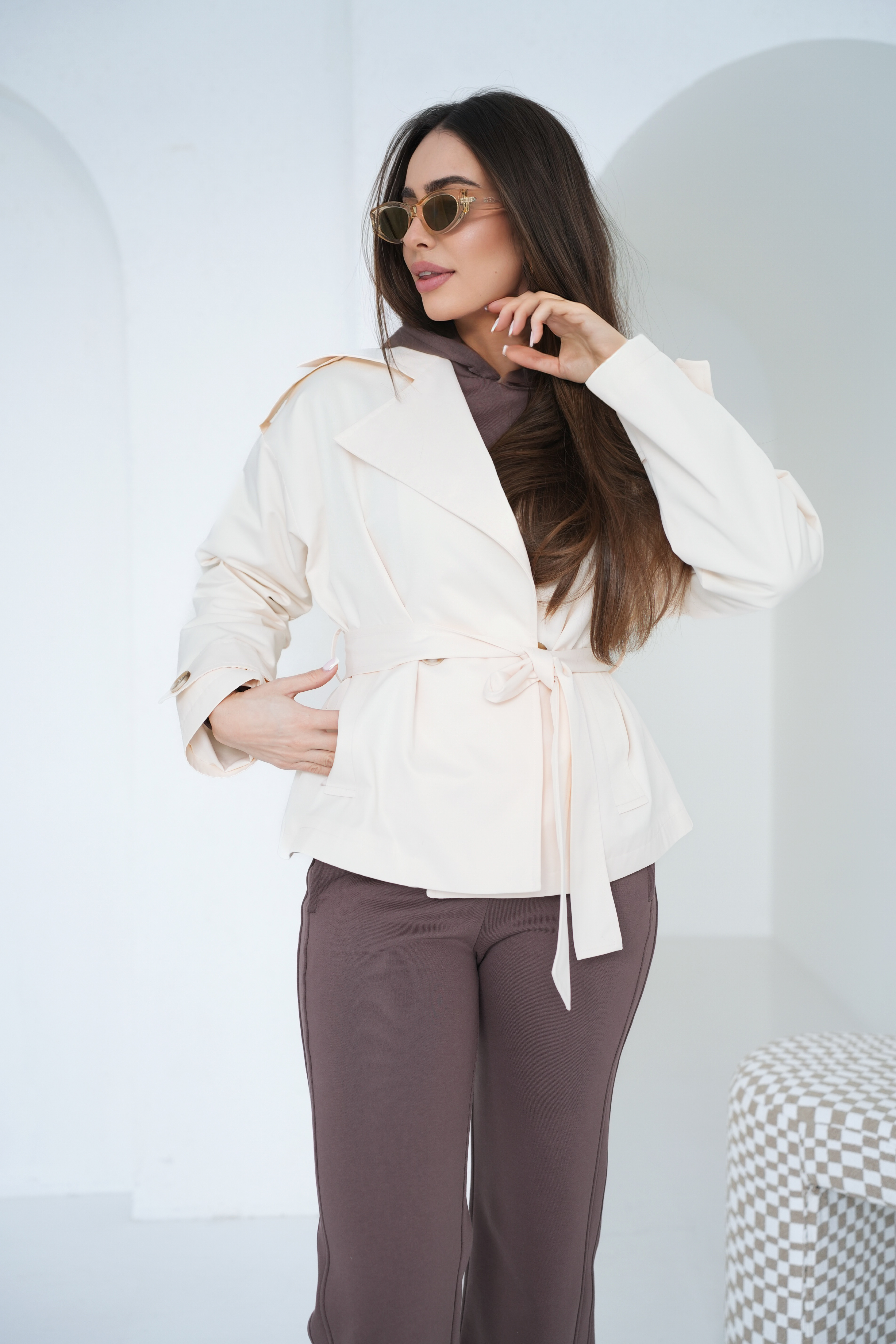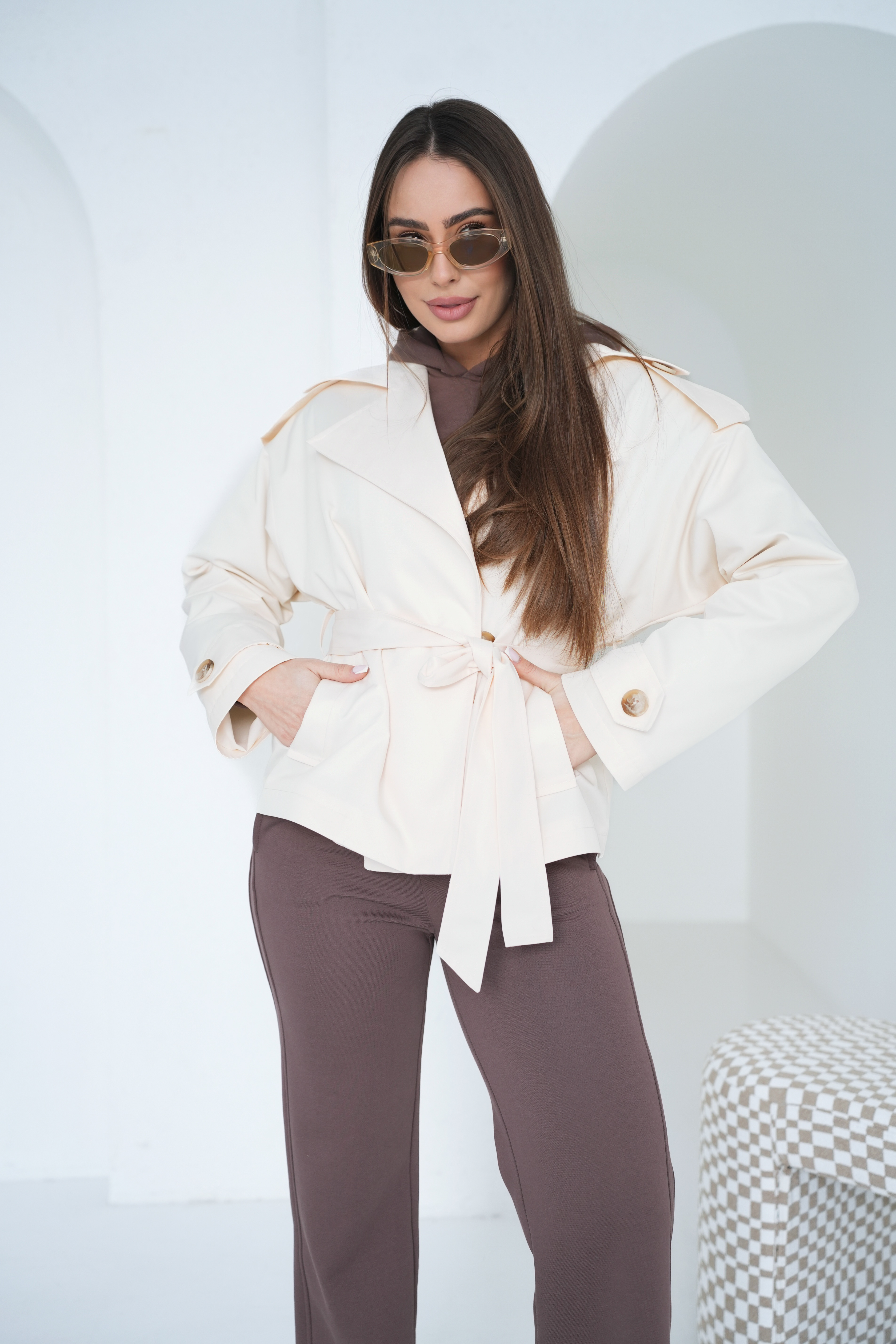 Trencz o skróconej, nowoczesnej formie, który podkreśla sylwetkę i nadaje stylizacji wyrazistego charakteru. Pasek w talii pozwala regulować dopasowanie i budować proporcje. Długość sprawia, że model świetnie współgra zarówno ze spodniami o wysokim stanie, jak i bardziej swobodnymi zestawami.